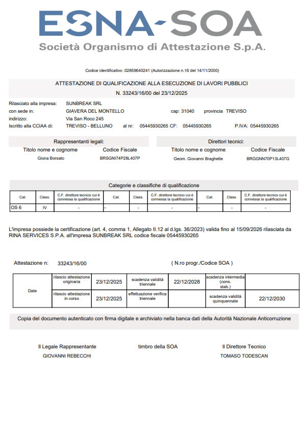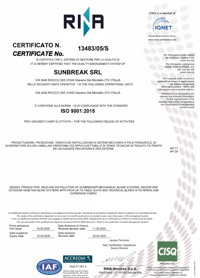 Certificata ISO 9001:2015 e SOA 0S6 IV, Sunbreak è il partner ideale per trovare soluzioni inedite e creative alle esigenze più diverse di schermatura solare.